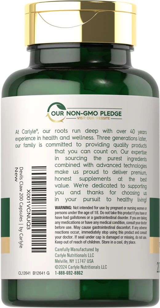 Experience the benefits of Carlyle's Devil's Claw in quick release capsules! Our advanced herbal supplement is gluten free and non-GMO, made with no artificial flavor or sweetener, making it an excellent addition to any wellness program.