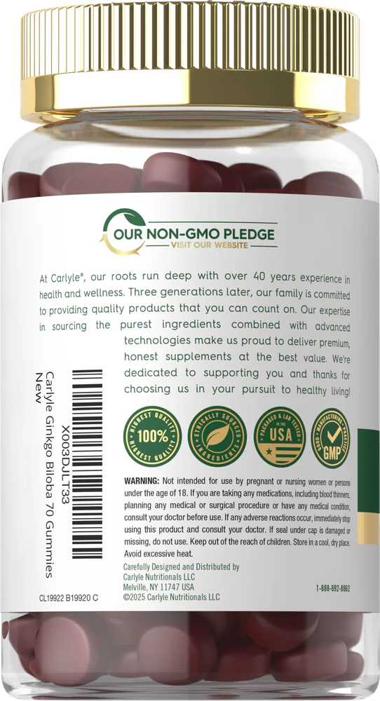 Carlyle's Ginkgo Biloba gummies deliver a blast of delicious fruit flavor and naturally occurring key nutrients that support your lifestyle. Made with the finest ingredients, each serving offers Ginkgo Biloba. Our vegan formula is made without gluten, making it a popular support supplement for men and women everywhere!