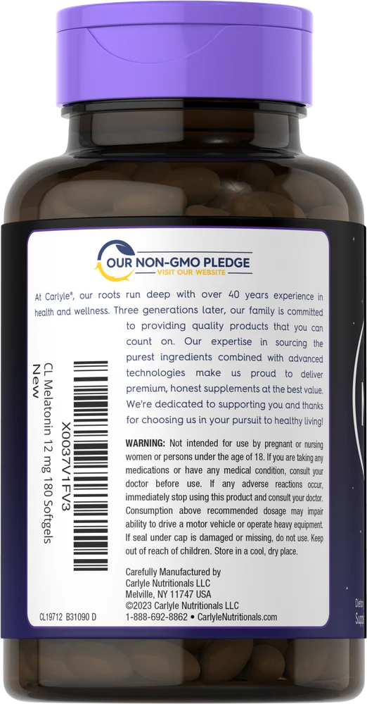 Carlyle's Extra Strength Melatonin features 12 mg Melatonin and is the perfect addition to your nighttime routine. Our quick-release softgels are made with no artificial sweetener, artificial flavor or preservatives, making it a great choice for men and women everywhere!