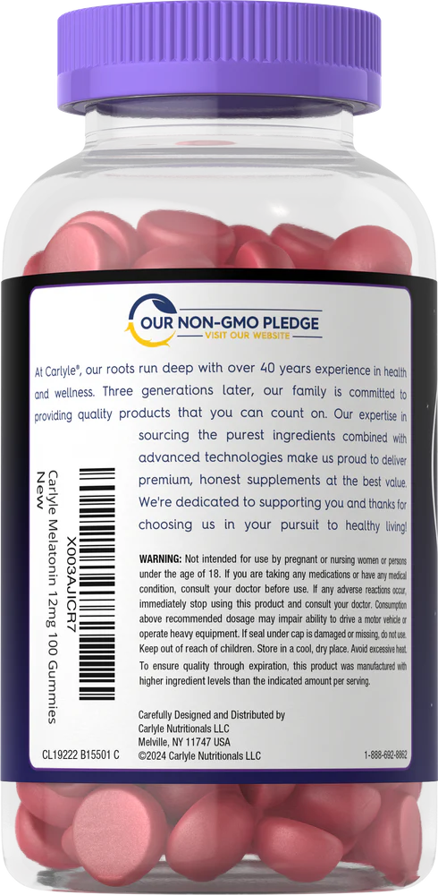 Deeply unwind with Carlyle's vegan Melatonin Gummies! They're made with berry flavor and provide 12mg of this beneficial substance per serving. Our formula is Gluten Free, Non-GMO and naturally free of artificial sweetener. It's the perfect way to add Melatonin to your nightly routine!