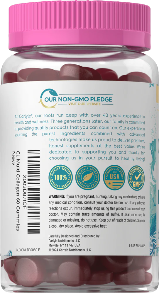 Carlyle’s Multi Collagen Gummies provide 150 mg of a proprietary blend of Collagen per serving with Types I, II, III, V, and X in a delicious Mixed Berry Flavor. It's gluten-free and non-GMO, lab tested for quality, making it a trusted source of Collagen for everyone.