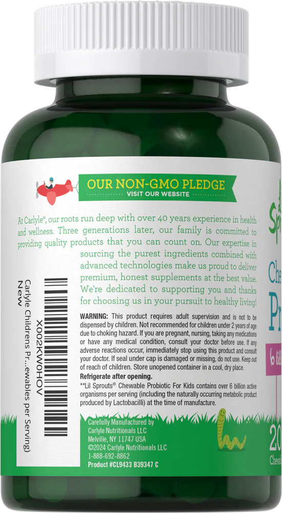 **Lil Sprouts Chewable Probiotic For Kids contains over 6 billion active organisms per serving (including the naturally occurring metabolic product produced by Lactobacilli) at the time of manufacture.